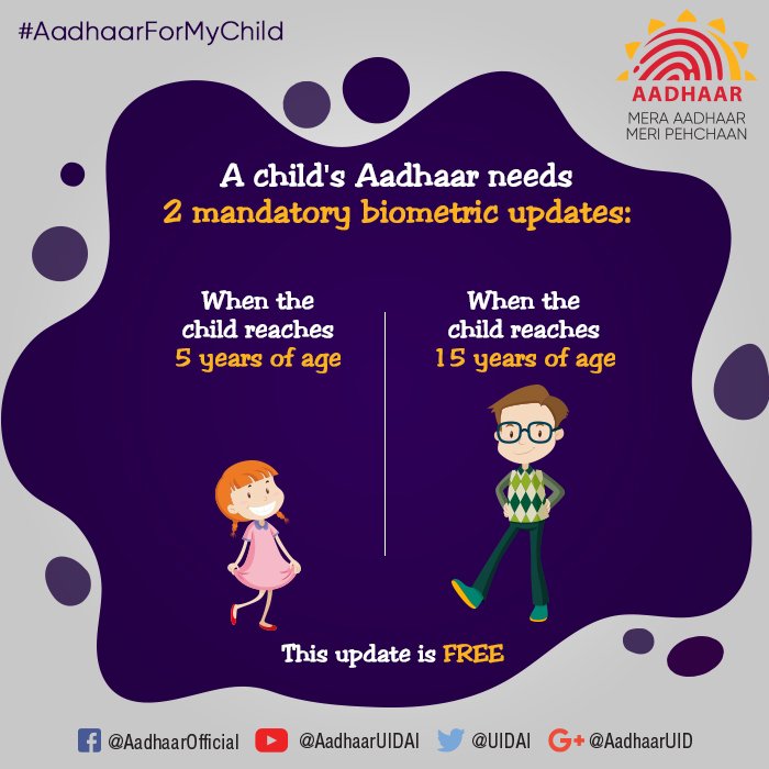“A child below 5 years of age gets a blue in coloured Aadhaar known as Baal Aadhaar. When the child becomes 5 years old, a mandatory biometric update is required,” UIDAI said.