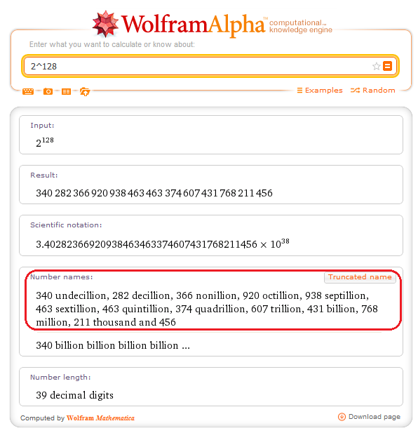 You may be aware that IPv6 can hold 2^128 IP addresses.2^128 = 340,282,366,920,938,463,463,374,607,431,768,211,456 Have you ever wondered how you would actually read this? Wolfram Alpha has the answer to this. Here’s how you can read the number, Read it out loud.